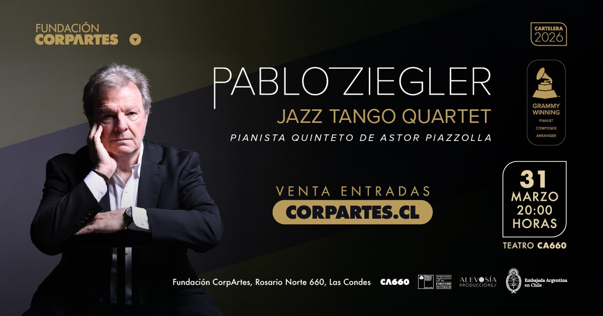 “Pablo Ziegler Jazz Tango Quartet”, presentado por Fundación CorpArtes y Alevosía Producciones, es un proyecto acogido a la Ley de Donaciones Culturales del Ministerio de las Culturas, las Artes y el Patrimonio.